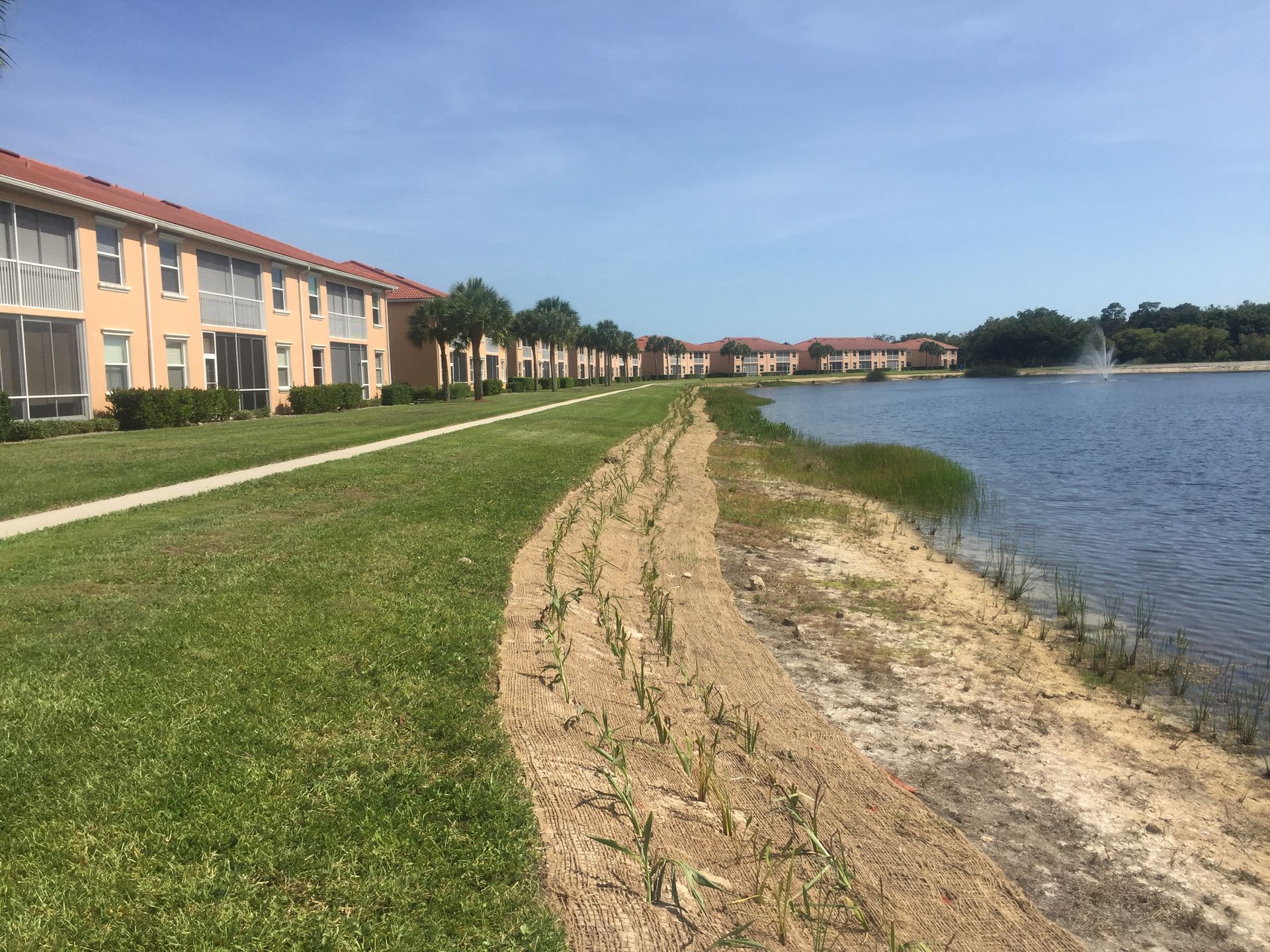 Some engineers that we work with gave us a RFP for a community in Ft. Myers with some severe lakeshore erosion. We proposed a value engineered solution and they hired us for the job. Our proposal detailed two different shoreline restoration and erosion control systems- one using our proprietary biodegradable matt and littoral plants and the other using rip rap. The end result saved the community $100,000’s and the littoral shelves are filling in nicely since then.