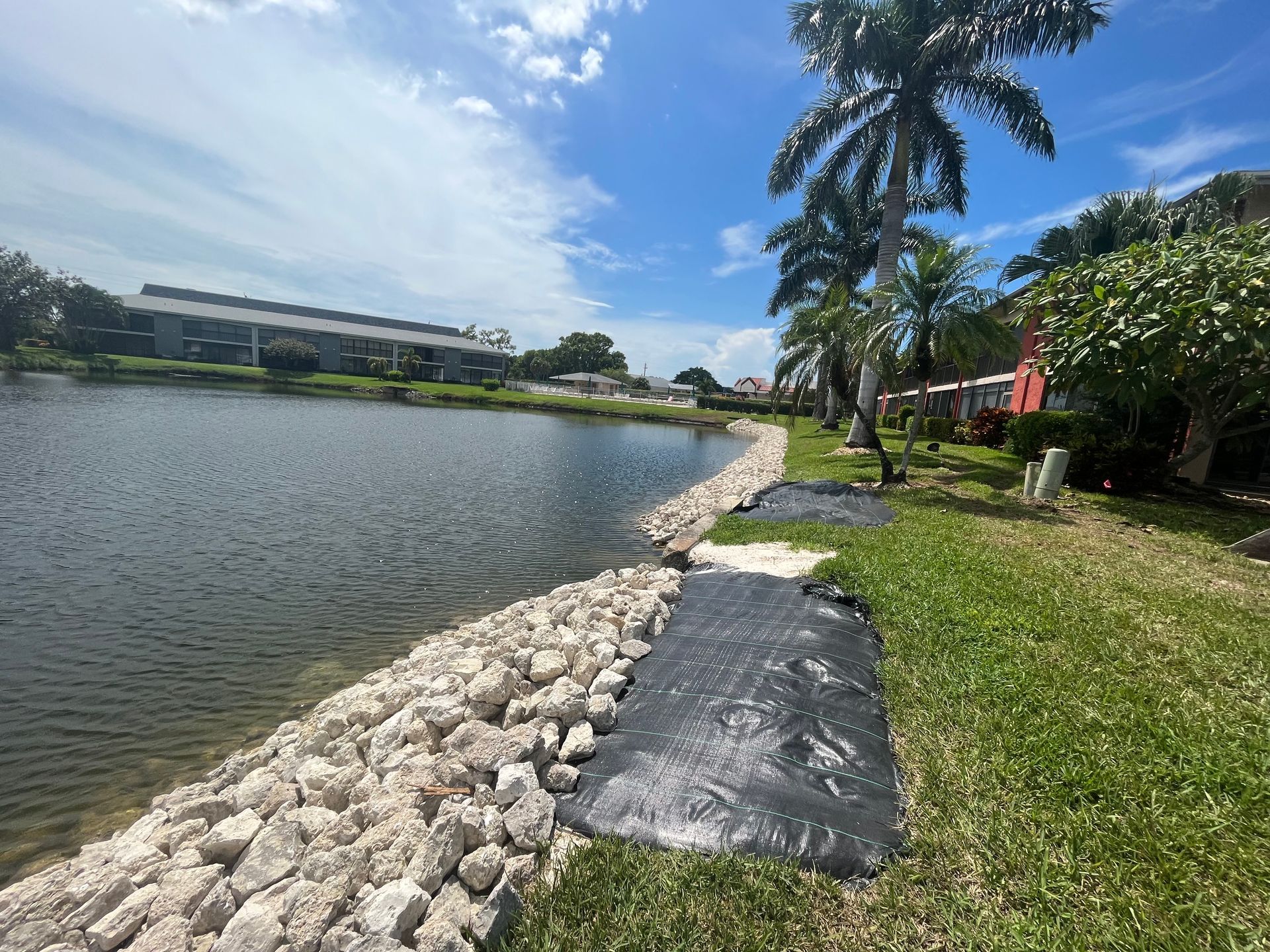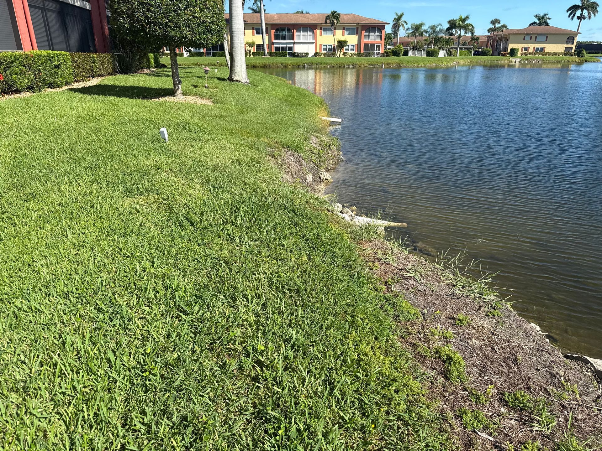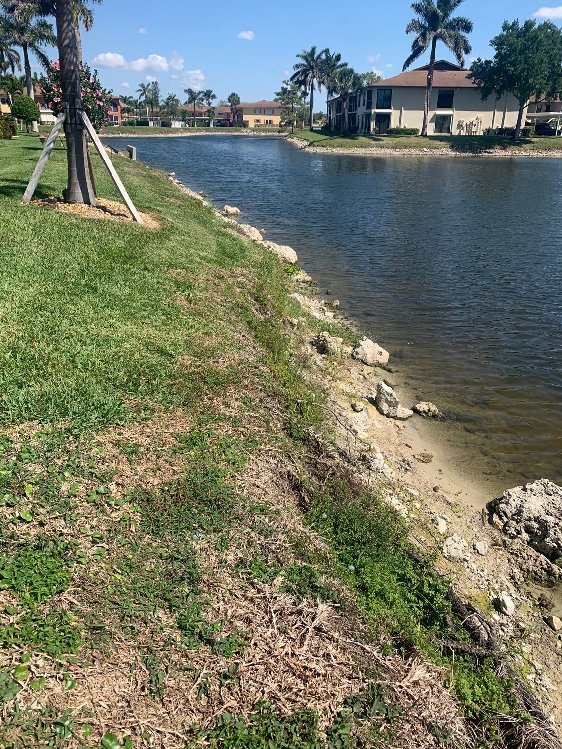 This is one of the phases within the Fountains private community in Naples, FL. Not only did the community have a problem with severe erosion, their shorelines and lakes were full of concrete, debris, and weeds. They wanted a permanent erosion control system to be installed, so we cleaned up and re-graded their shorelines before installing our proprietary Erosion Defense SystemTM. The shorelines we addressed are now in compliance, their lakes are more beautiful, and their neighbors in a different phase have asked us for a proposal on their lakes as well!