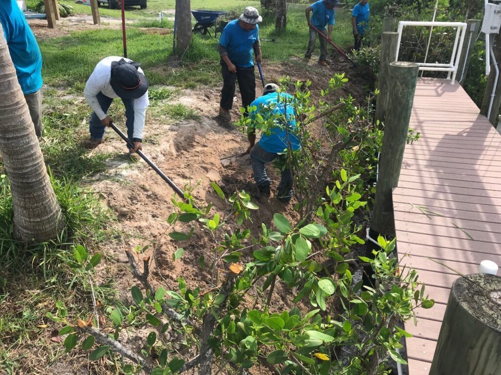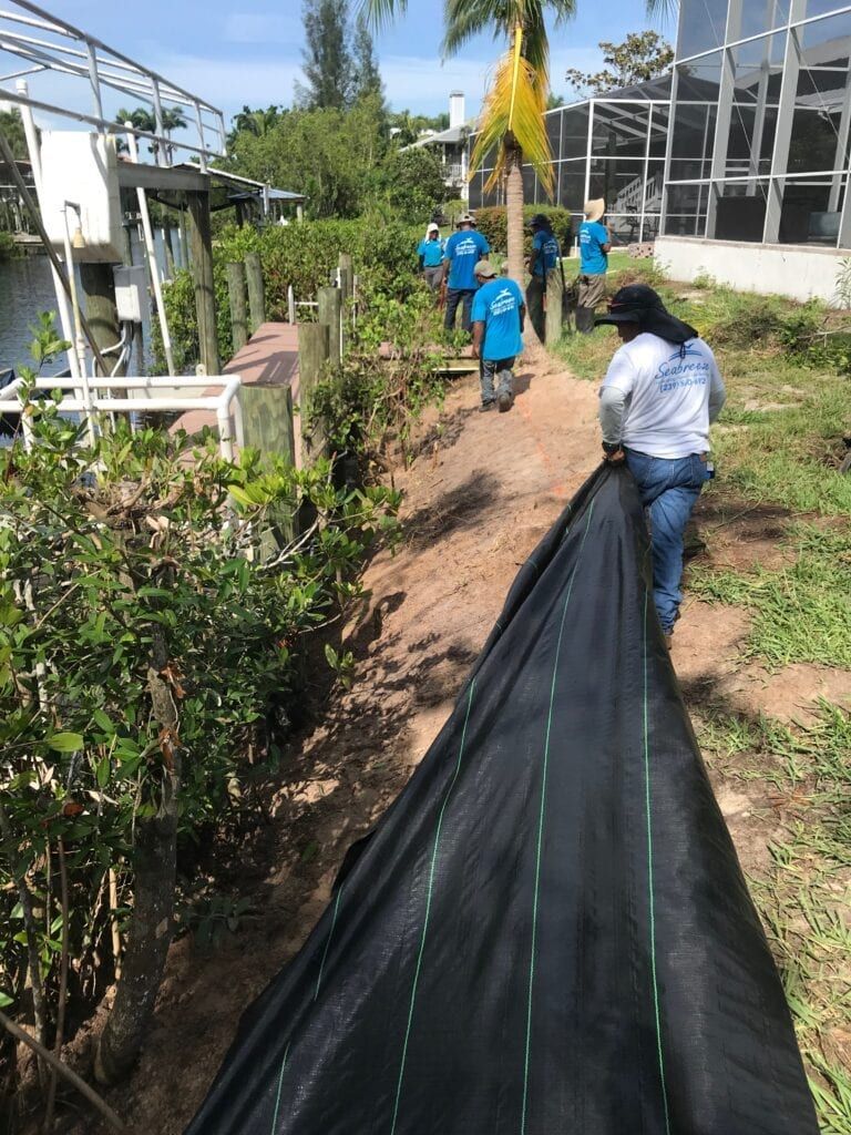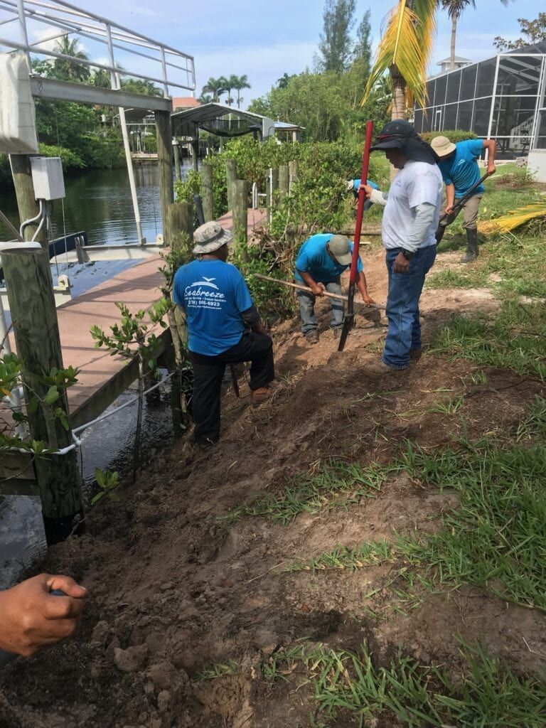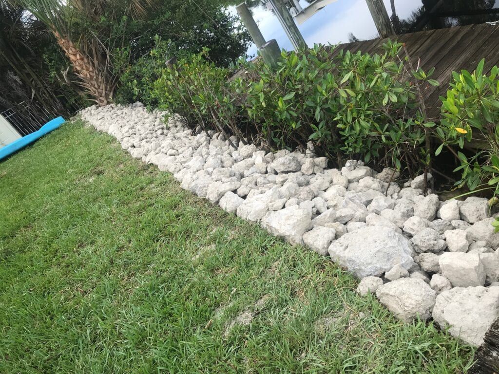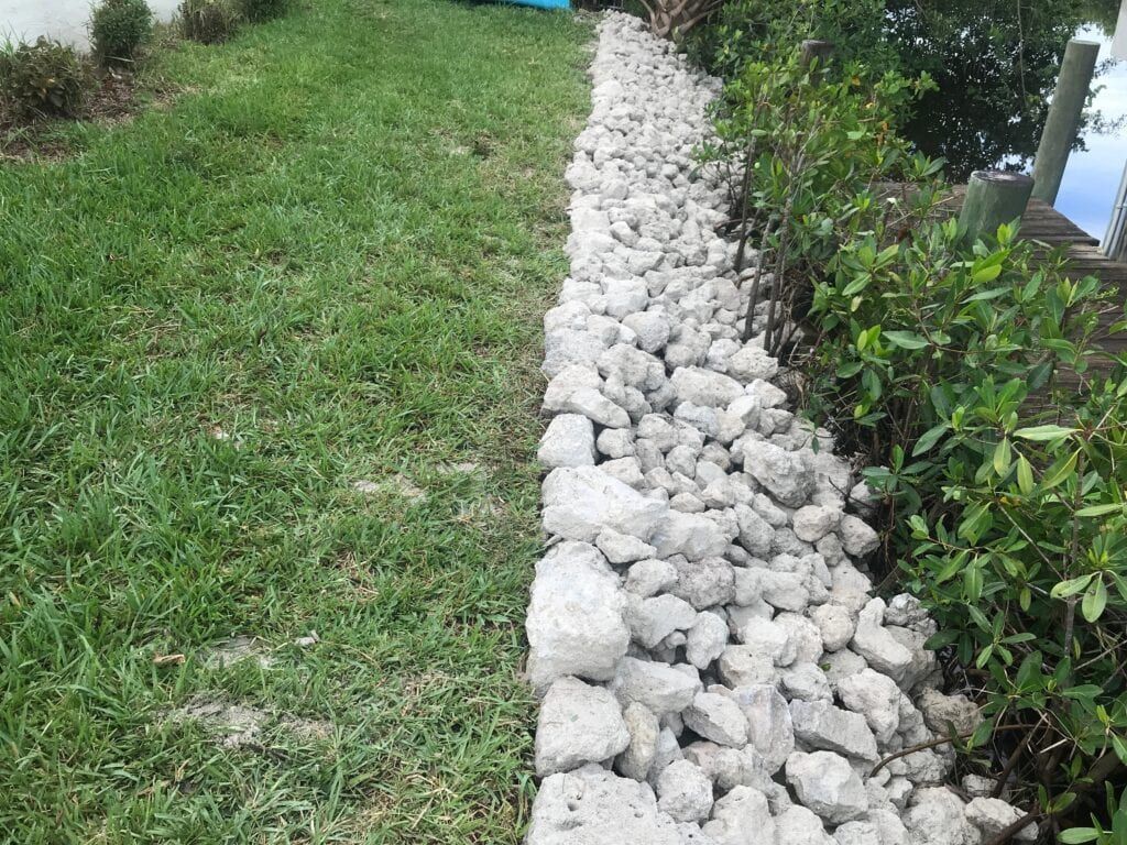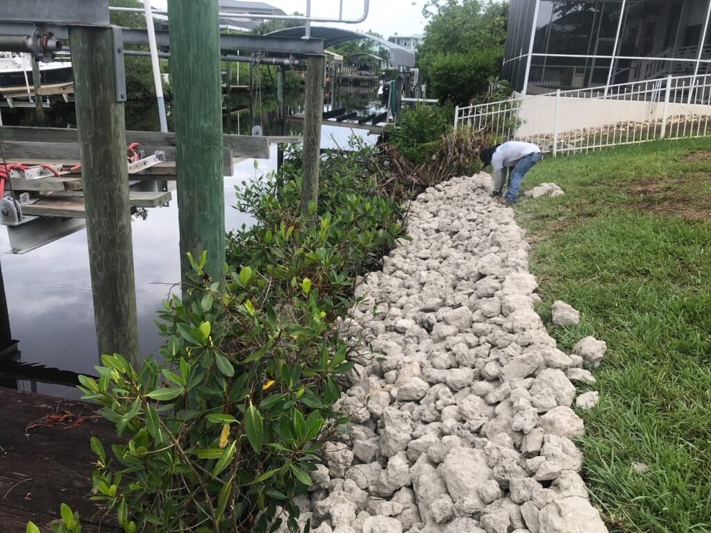 This canal shoreline had no erosion control system in place! We were hired to install a complete rip rap shoreline system and also reinforce the timber pilings. Additionally, we graded the top of the bank where the yard begins and re-sodded it to provide the client with a total solution! She was so happy that she hired us to install a similar system on her second property down the street. Then, her neighbor asked us to restore their canal shoreline as well. We expect to get more work from this neighborhood in the future!